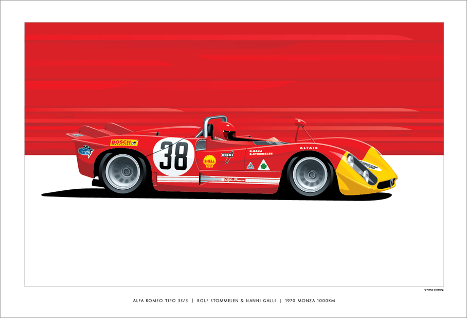 The Alfa Romeo Tipo 33/3 driven by Rolf Stommelen and Nanni Galli at the 1970 Monza 1000 km. The number 38 Alfa Romeo finished 7th overall, and third in the 3-litre Prototype class. Alfa Romeo’s Autodelta team brought 4 cars to Autodromo Nazionale di Monza – the number 41 Alfa driven by Andrea de Adamich and Piers Courage finished 13th, the number 39 and number 40 cars failed to finish the race due to mechanical issues. Autodelta brought the 4 cars (with special Coda Lunga bodywork) to Le Mans in June, unfortunately none of the cars finished the race.