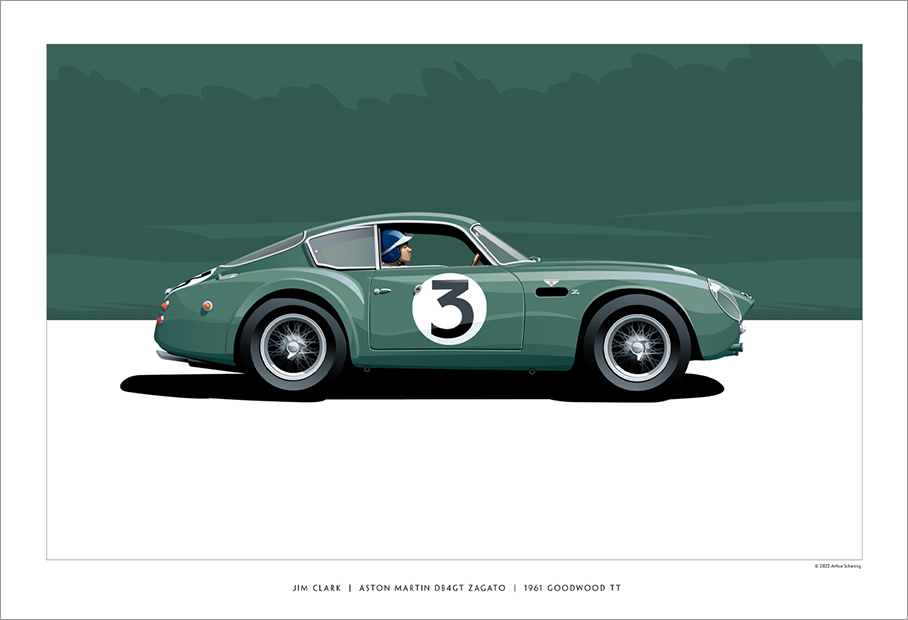 Jim Clark driving the Essex Racing Team Aston Martin DB4GT Zagato at the 1961 Goodwood Tourist Trophy. The 1961 Goodwood TT was won by Stirling Moss driving a Ferrari 250 GT SWB, the same car he won with the previous year, Clark finished in 4th place. The Aston Martin (registration number “2 VEV”) started its career at Le Mans earlier in 1961 where it failed to finish the race due to mechanical issues. The DB4 had an impressive season afterwards, primarily at the hands of Jim Clark. Clark returned to the Goodwood TT in 1962 driving the rebuilt (in fact new) DB4 (2 VEV, driven at the time by Lucien Bianchi, was involved in a heavy crash at Spa earlier in the year). Clark failed to finish the race after a spin on-track collected John Surtees’ Ferrari 250 GTO which was in the lead at the time. After removing themselves from their cars, Surtees glanced at Clark, but no harsh words were spoken. Clark would later say, “I think I’d have been more upset than he was if I’d been leading. In fact, he was very good about it…”. 2 VEV was fixed once again, but it blew an engine at the next race and was retired from racing.