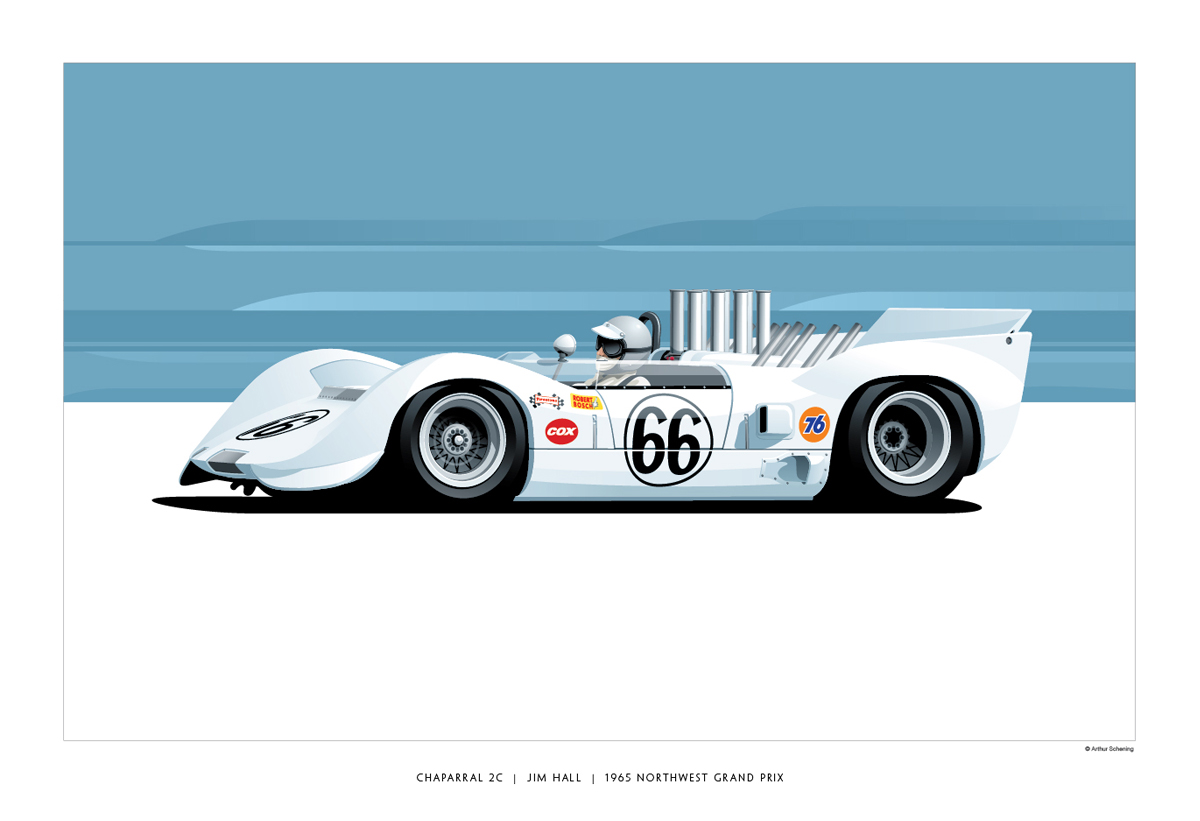 The Chevrolet powered Chaparral 2C driven by Jim Hall at the 1965 Pacific Northwest Grand Prix in Kent, Washington. The debut weekend for the Chaparral 2C was a great success, Hall qualified the 2C on the pole, and won both heats. The 2C was lighter than the Chaparral 2, which had won Sebring earlier in the year, and it introduced a new two-position rear flap to balance aerodynamic downforce. During the 1965 racing season Hall continuously improved the aerodynamics of the Chaparral, making it capable of running faster and faster laps. Most of his competitors failed to figure out what Hall was doing, so the Chaparrals were almost unbeatable all season.